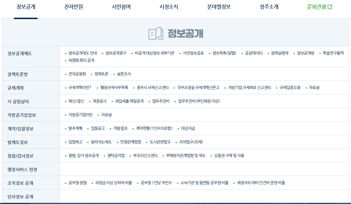 청주시청 홈페이지에 접속하면 왼쪽부터 정보공개, 전자민원, 시민참여, 시정소식, 분야별 정보, 청주소개 메뉴가 보입니다.