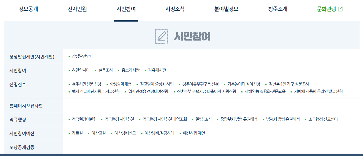 다시 청주시청 홈페이지로 돌아와서 시민참여 메뉴를 보시면 여러가지 신청을 하실 수가 있습니다.