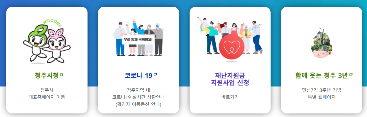 처음 청주시청 홈페이지에 접속하시면 청주시청 홈페이지에 바로 접속되는 것이 아니고 왼쪽부터 청주시청, 코로나 19, 재난지원금 등이 보입니다.