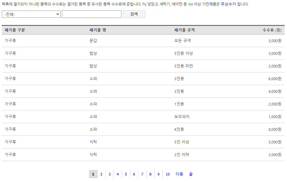 가구 검색창이며 가구를 검색하시면 이렇게 폐기물 구분, 폐기물 명, 폐기물 규격, 수수료를 확인하실 수가 있습니다.