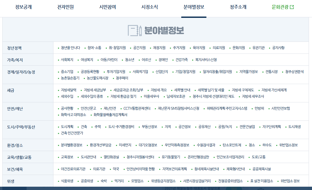 마지막으로 청주시청 홈페이지에서 가장 중요하다고 생각하는 것은 분야별 정보입니다.