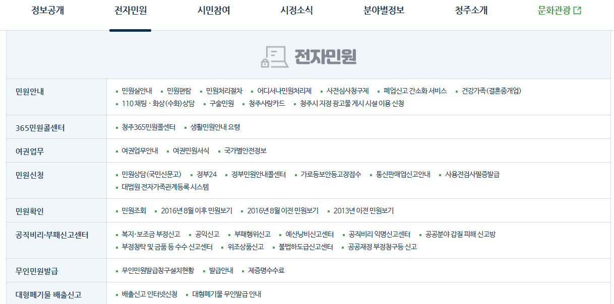 그리고 전자 민원 메뉴를 보시면 민원실 안내, 민원 편람, 민원처리절차, 여권 업무, 민원상담 국민신문고, 정부 24, 민원 조회, 무인빈원발급, 대형폐기물 배출 신고 등이 보입니다.